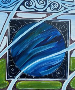 Painted design for a stained glass window. I was fascinated by glass for a time. The line from the old hymn ‘A man who looks on glass, on it may stay his eye, or if he pleases through it pass, and then shall heaven espy’ wandered round and round my head for a number of years. I designed windows and painted glass and mirrors. This was a rough design for a window in a friends house looking out onto their field. We were both inspired by celtic design having visited The Hill of Tara